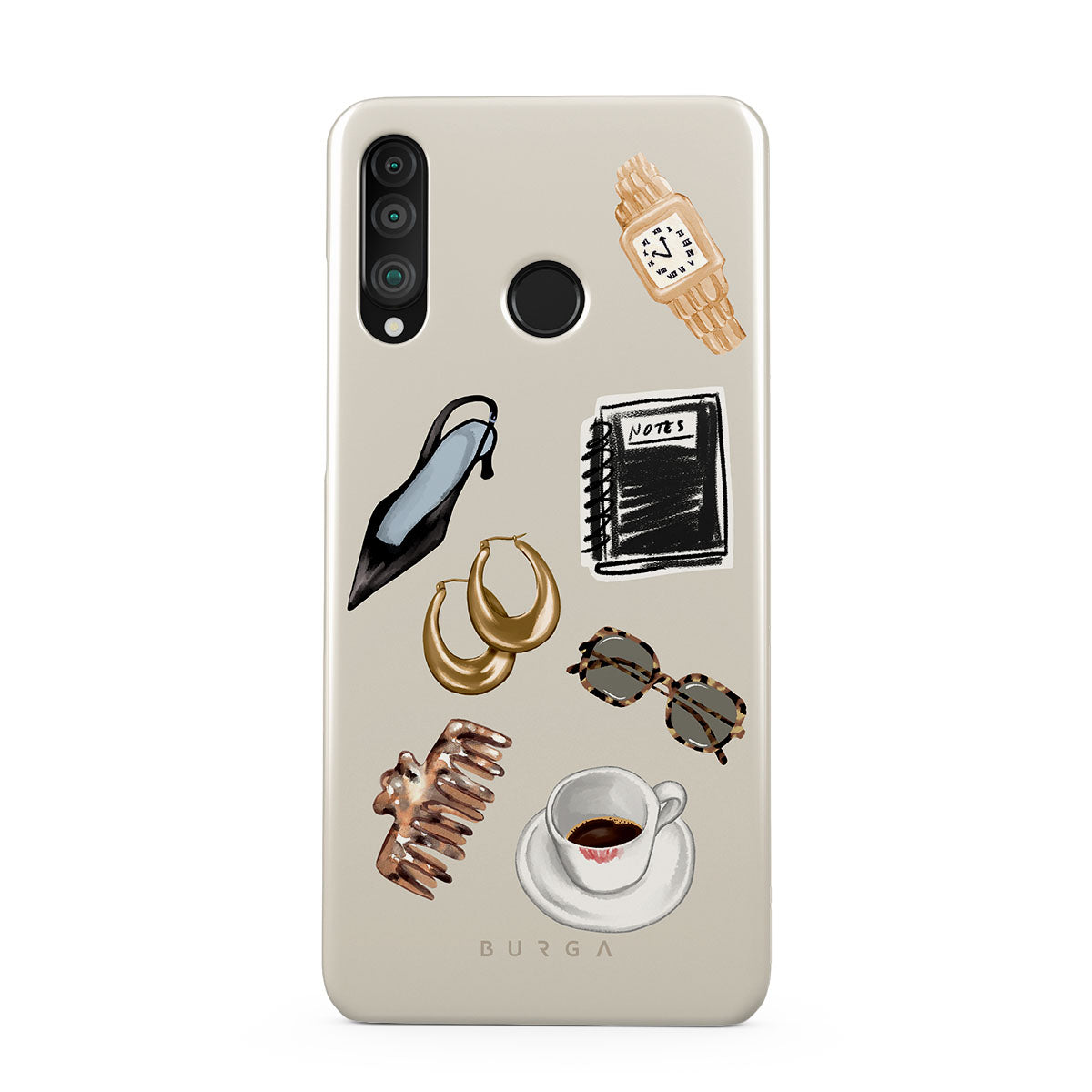 このデザインの特徴:、黒いハイヒール、ゴールドのフープピアス、黒いノート、コーヒーカップ、べっ甲柄のメガネ、ブラウンのシュシュ、レトロなゴールドウォッチが含まれています。