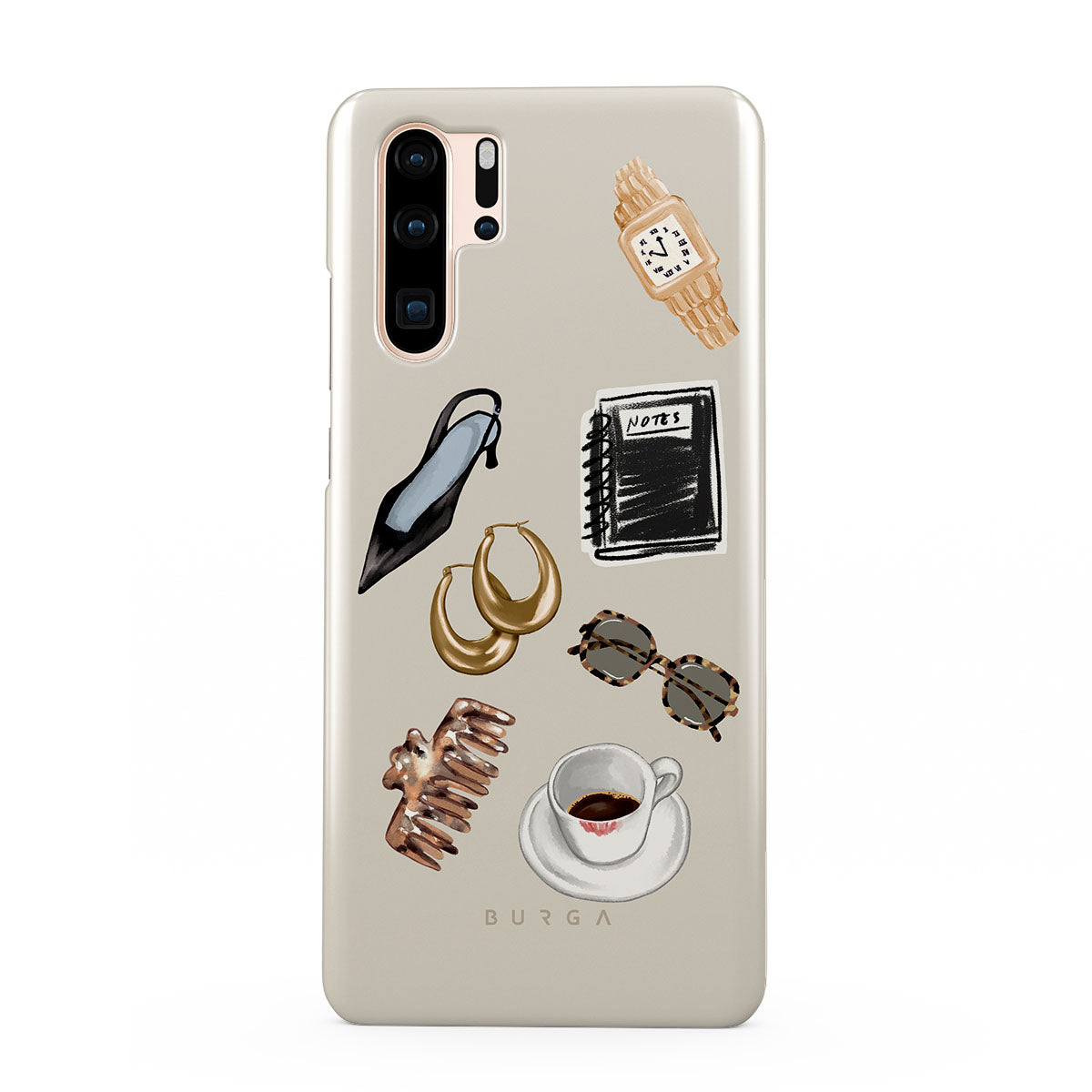 このデザインの特徴:、黒いハイヒール、ゴールドのフープピアス、黒いノート、コーヒーカップ、べっ甲柄のメガネ、ブラウンのシュシュ、レトロなゴールドウォッチが含まれています。