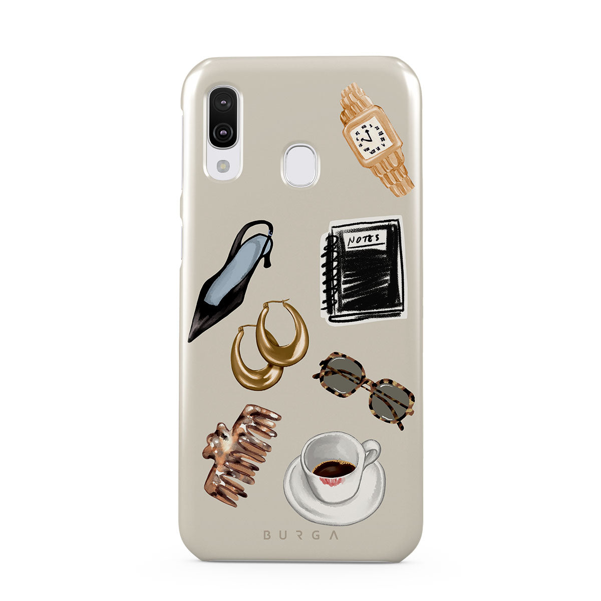 このデザインの特徴:、黒いハイヒール、ゴールドのフープピアス、黒いノート、コーヒーカップ、べっ甲柄のメガネ、ブラウンのシュシュ、レトロなゴールドウォッチが含まれています。