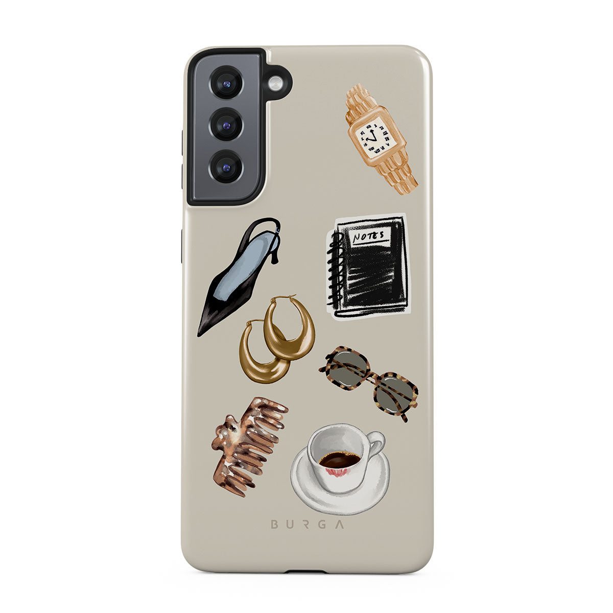 このデザインの特徴:、黒いハイヒール、ゴールドのフープピアス、黒いノート、コーヒーカップ、べっ甲柄のメガネ、ブラウンのシュシュ、レトロなゴールドウォッチが含まれています。