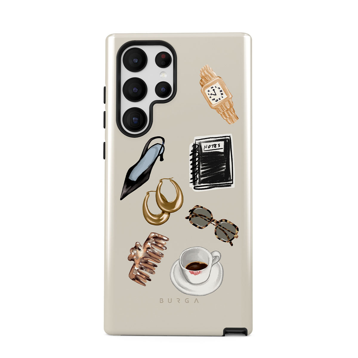 このデザインの特徴:、黒いハイヒール、ゴールドのフープピアス、黒いノート、コーヒーカップ、べっ甲柄のメガネ、ブラウンのシュシュ、レトロなゴールドウォッチが含まれています。
