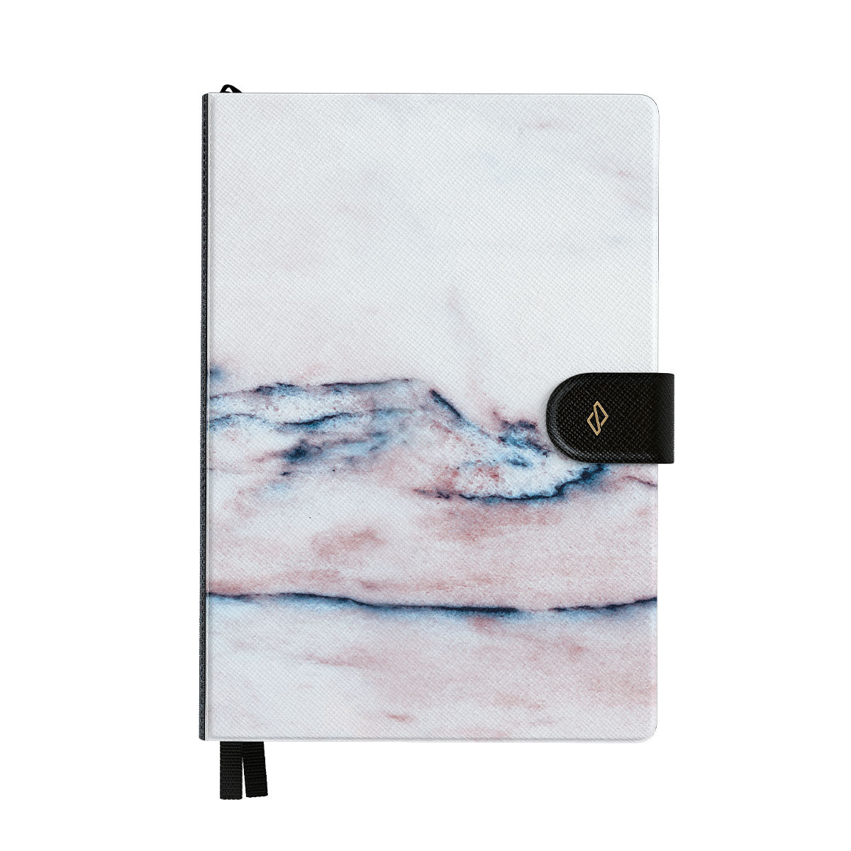 日付が書かれていないミニマリストなデザインで、手帳・スケジュール帳・ダイアリーとして使えます。表紙のハードカバーには、心地よい手触りのヴィーガンサフィアーノレザーを使用。スリムな磁気べえると付きの頑丈な手帳で、コーヒーをこぼしたり、うっかり手帳を落としたりしても安心です。