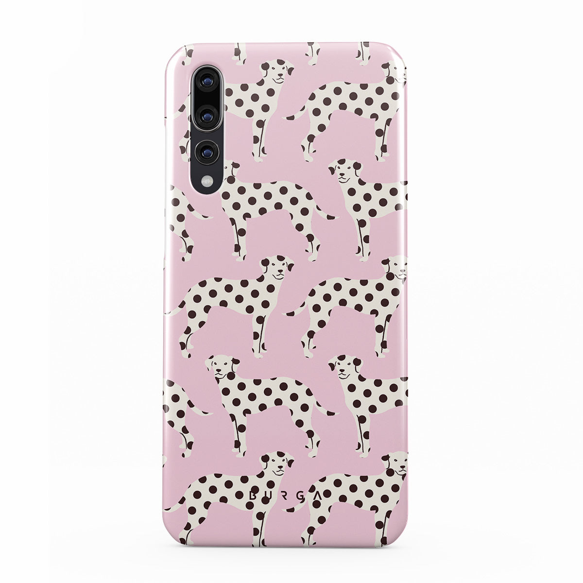 このデザインの特徴:ベビーピンクの背景に描かれたダルメシアンの犬が特徴です。