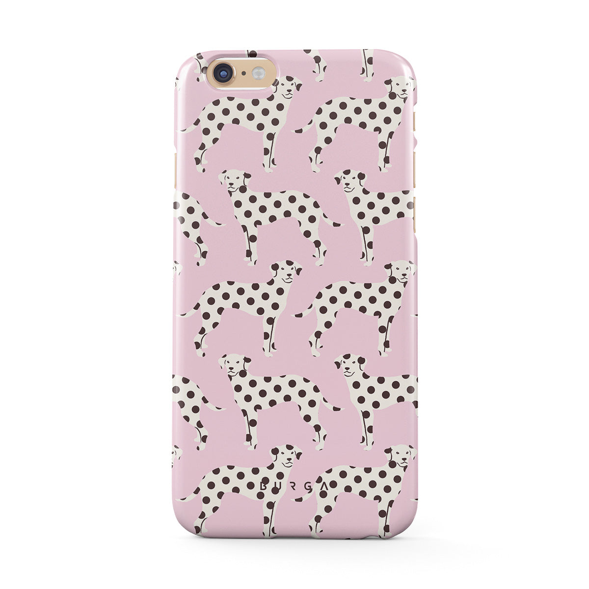 このデザインの特徴:ベビーピンクの背景に描かれたダルメシアンの犬が特徴です。