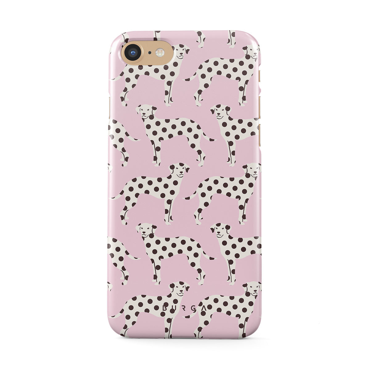 このデザインの特徴:ベビーピンクの背景に描かれたダルメシアンの犬が特徴です。