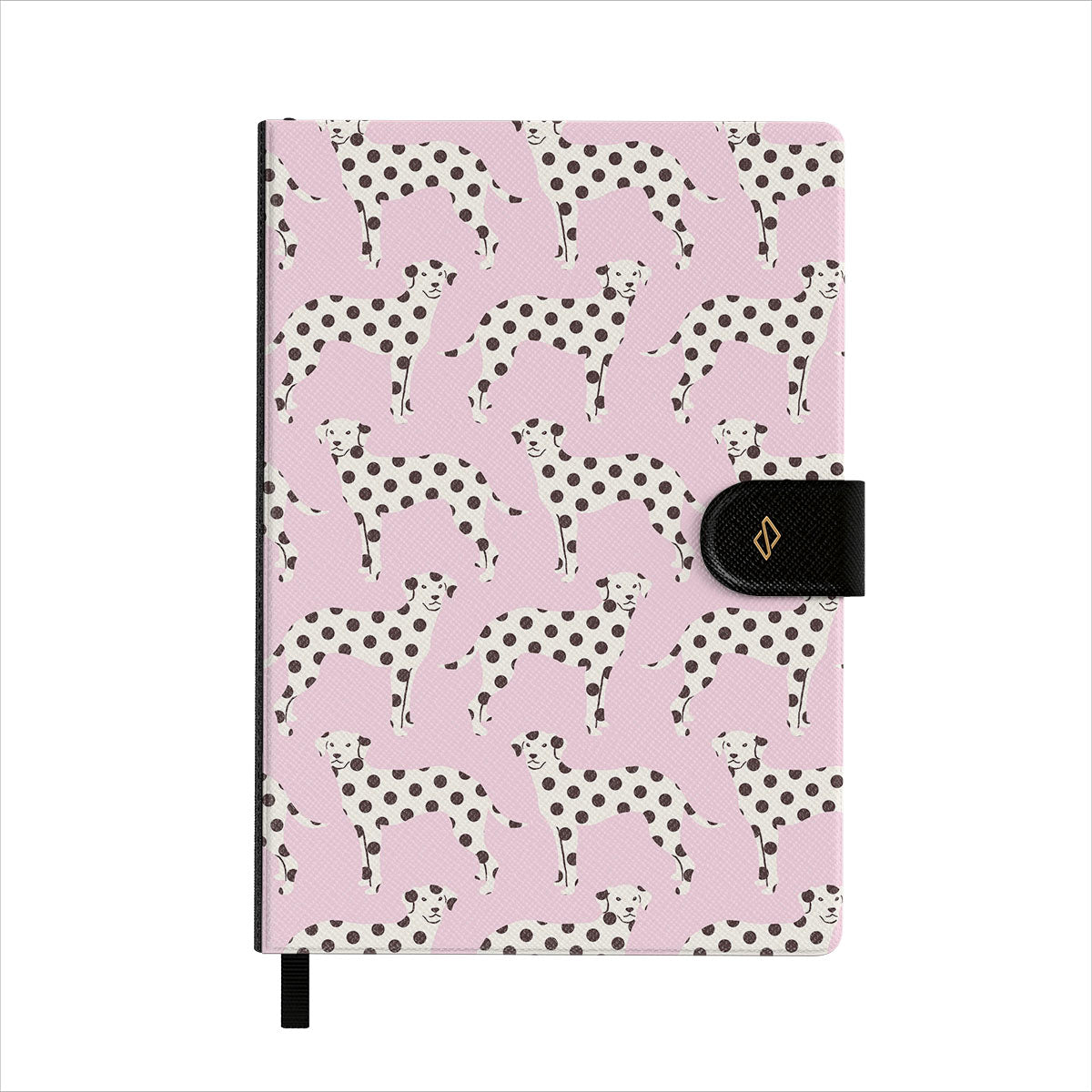 このデザインの特徴:ベビーピンクの背景に描かれたダルメシアンの犬が特徴です。