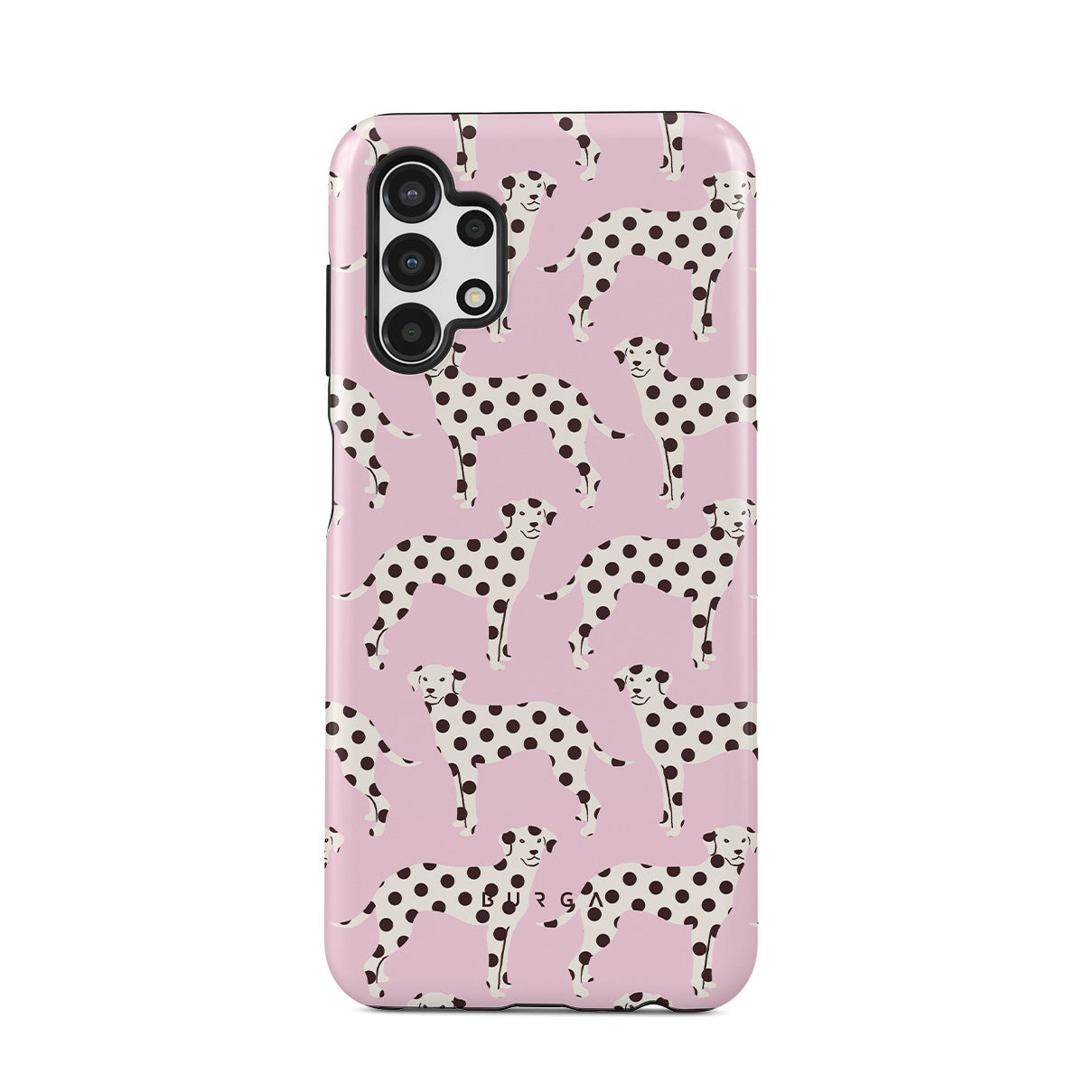 このデザインの特徴:ベビーピンクの背景に描かれたダルメシアンの犬が特徴です。