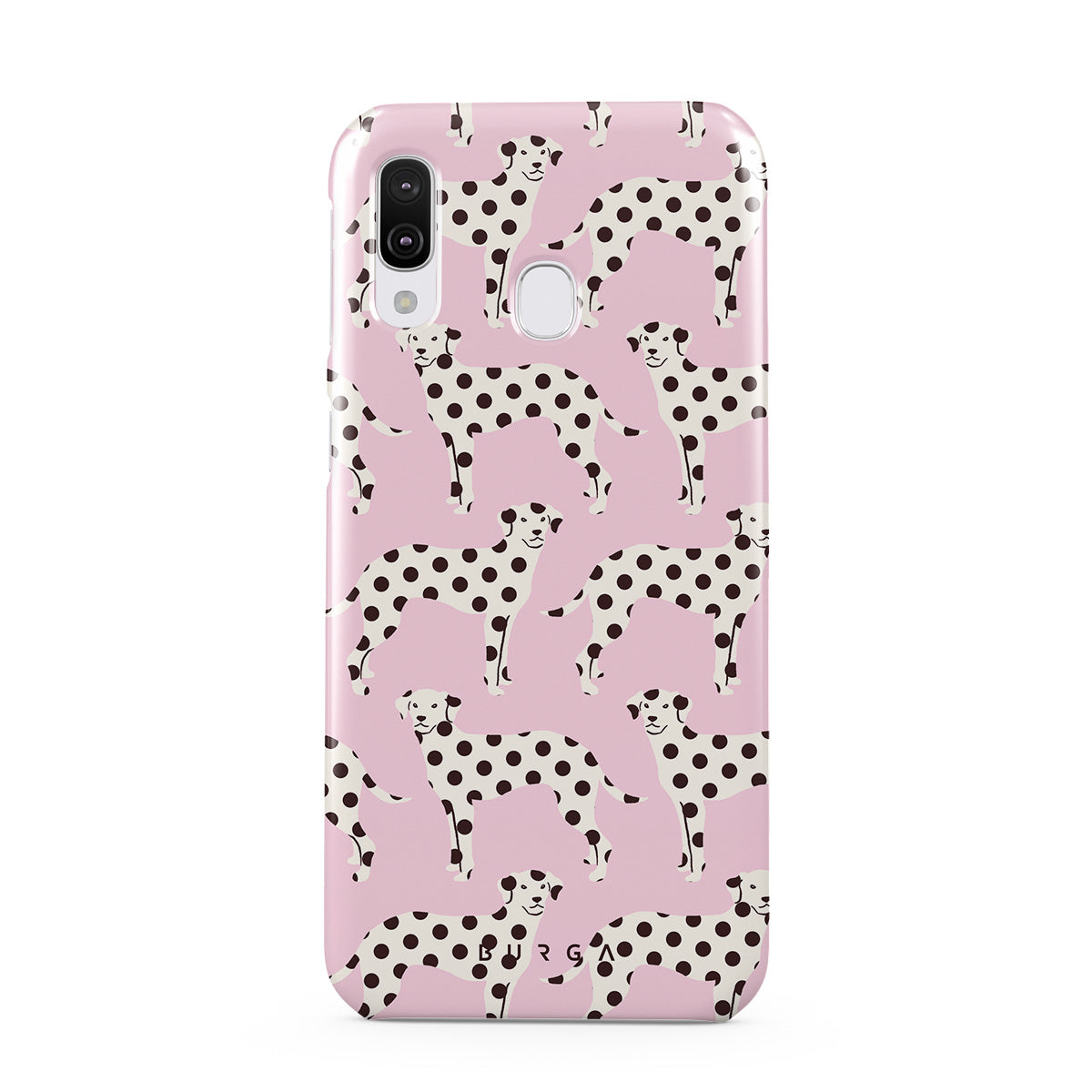 このデザインの特徴:ベビーピンクの背景に描かれたダルメシアンの犬が特徴です。