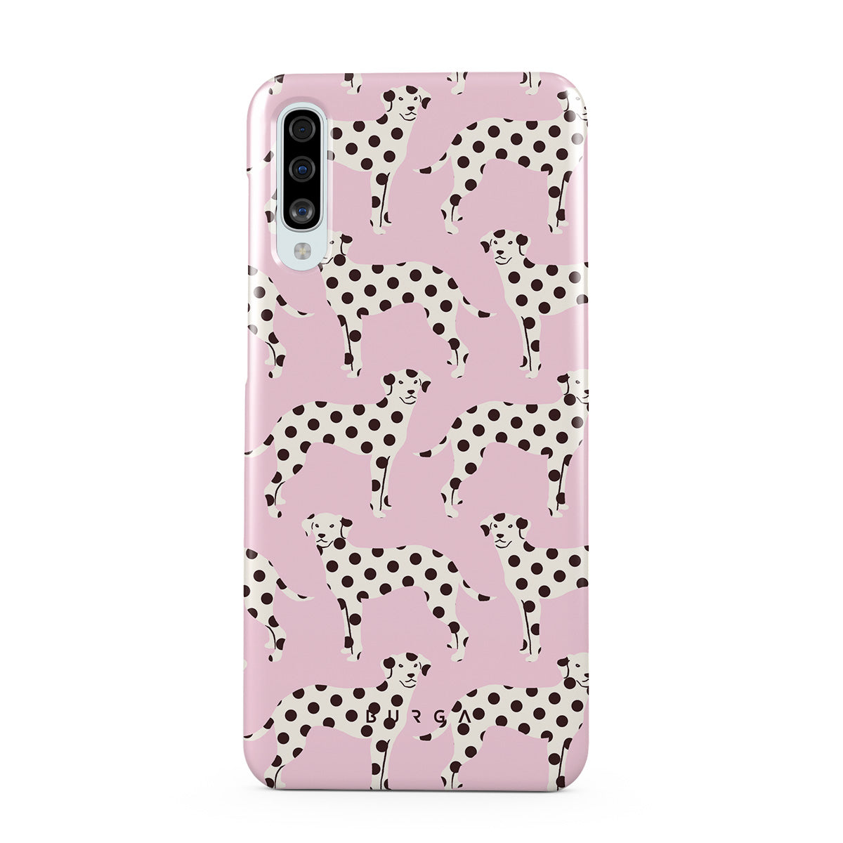 このデザインの特徴:ベビーピンクの背景に描かれたダルメシアンの犬が特徴です。