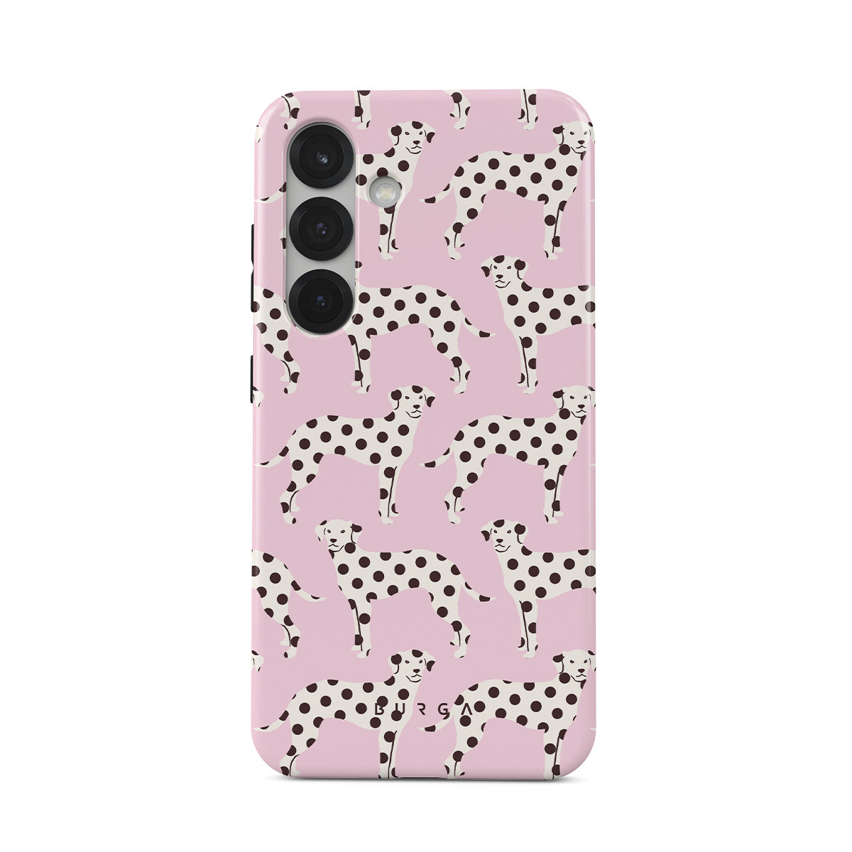 このデザインの特徴:ベビーピンクの背景に描かれたダルメシアンの犬が特徴です。