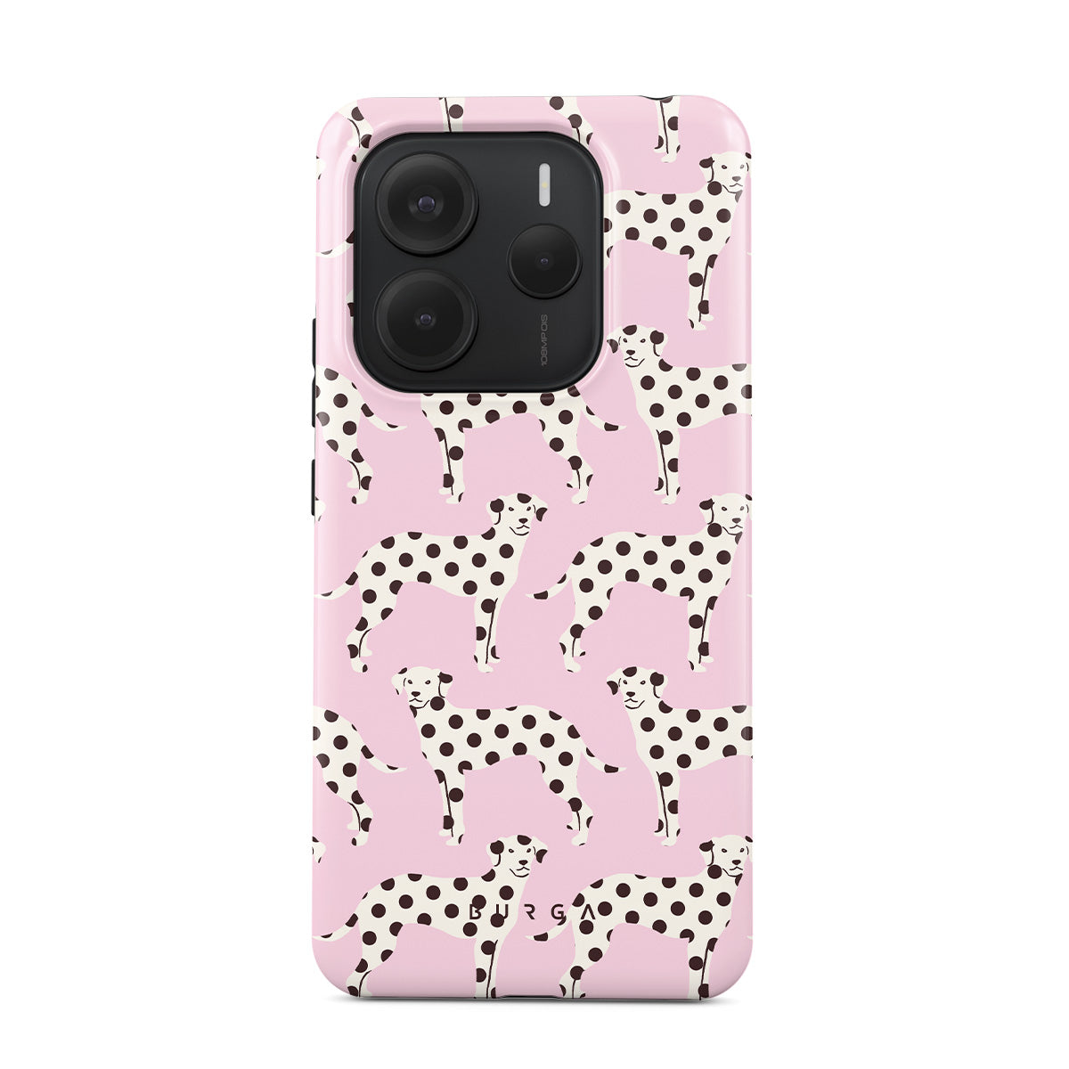このデザインの特徴:ベビーピンクの背景に描かれたダルメシアンの犬が特徴です。