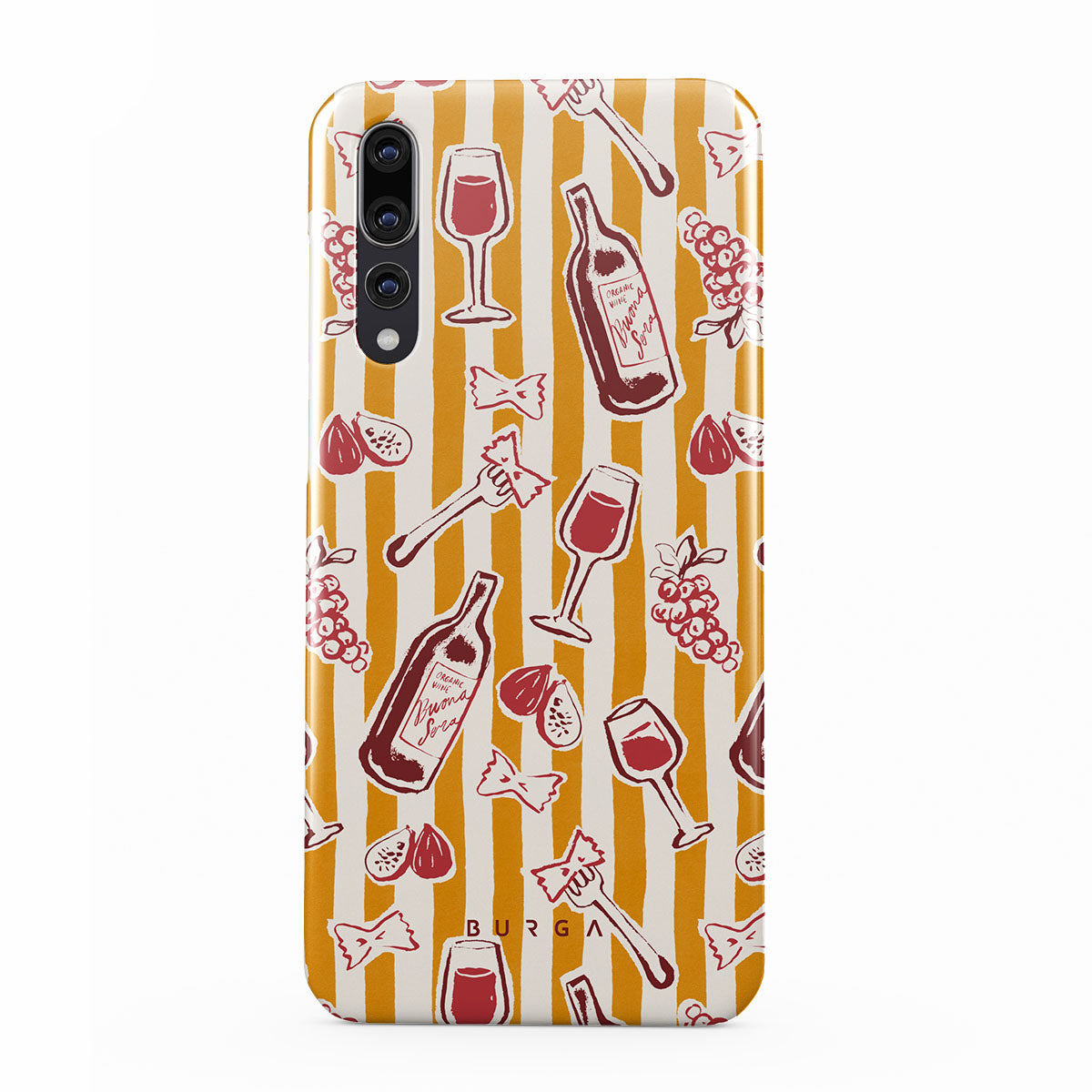 このデザインの特徴カキ、フルーツ、イチジク、ブドウ、フォーク、パスタ、ワイン、グラス、ストライプが描かれています。