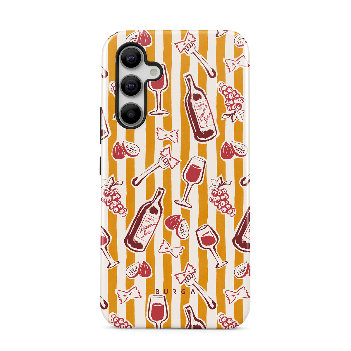 このデザインの特徴カキ、フルーツ、イチジク、ブドウ、フォーク、パスタ、ワイン、グラス、ストライプが描かれています。