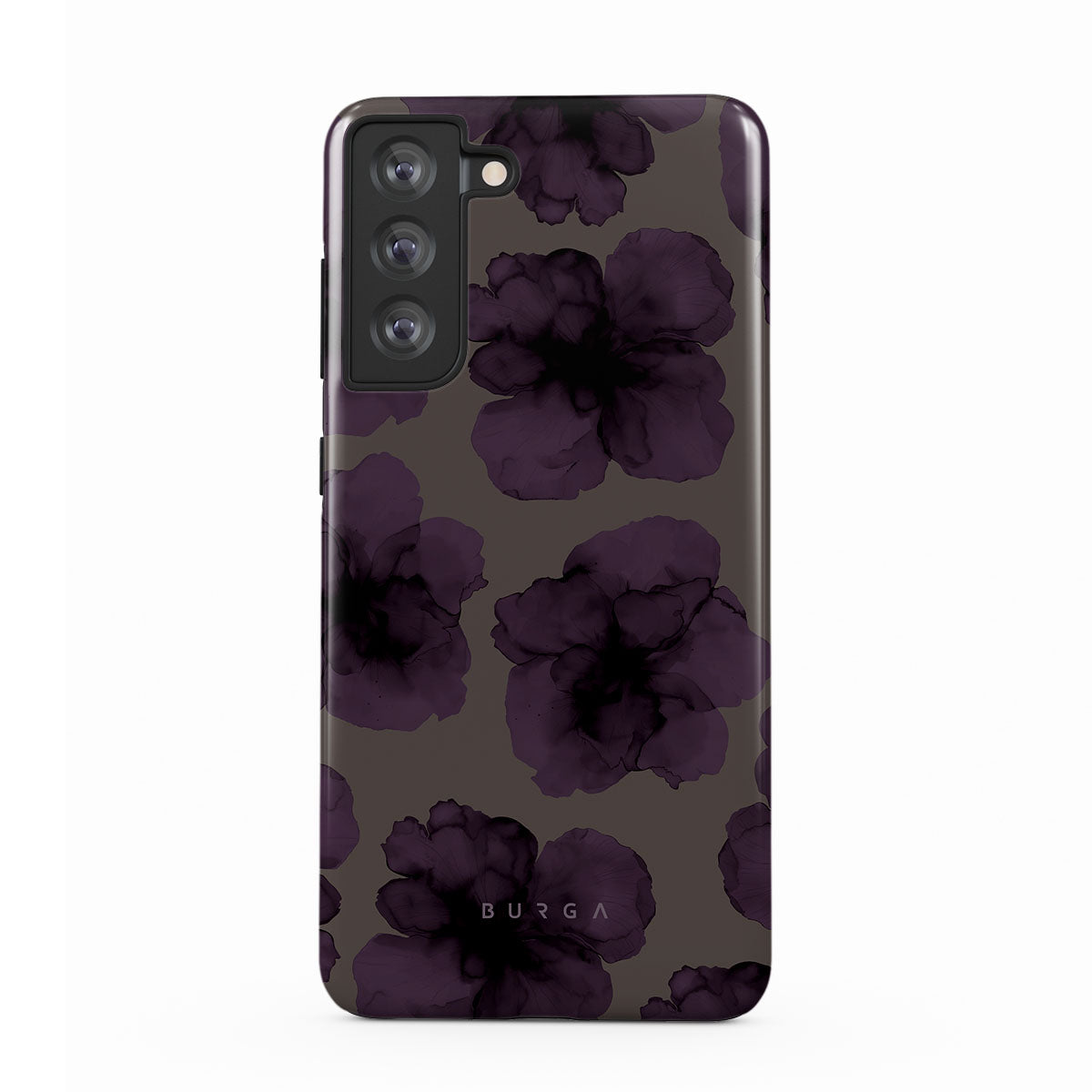 このデザインの特徴:深い色の花柄、紫色の花、すみれ色の花びら。