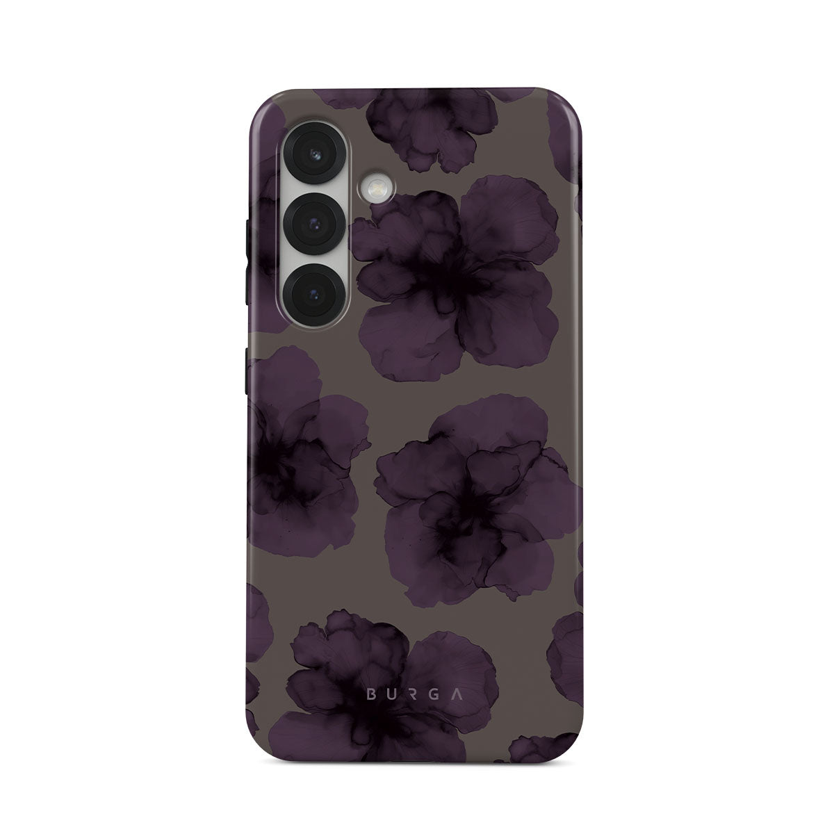 このデザインの特徴:深い色の花柄、紫色の花、すみれ色の花びら。