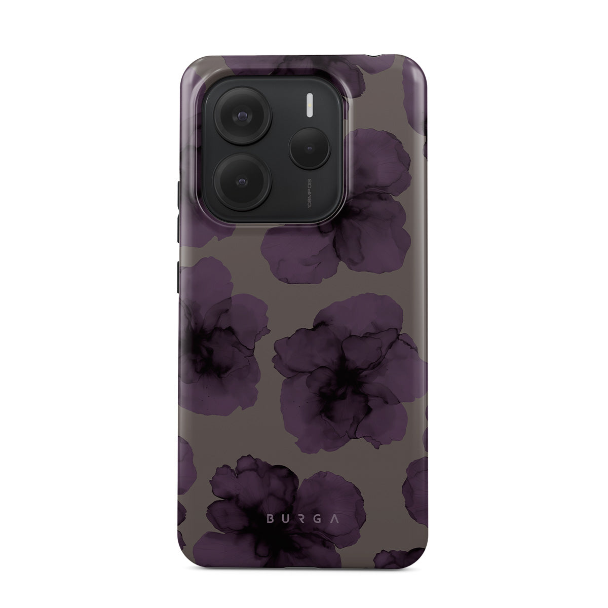 このデザインの特徴:深い色の花柄、紫色の花、すみれ色の花びら。
