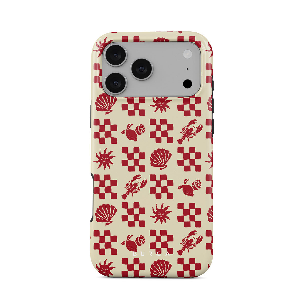 このデザインの特徴赤いチェック柄、貝殻、ロブスター、イタリアンモチーフが含まれています