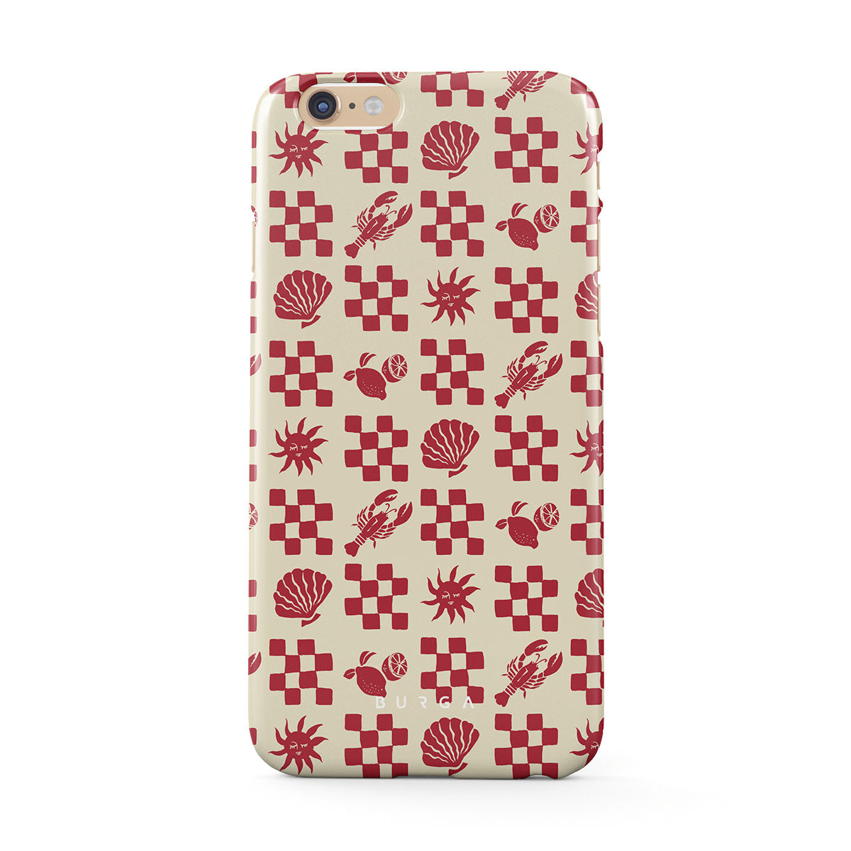 このデザインの特徴赤いチェック柄、貝殻、ロブスター、イタリアンモチーフが含まれています