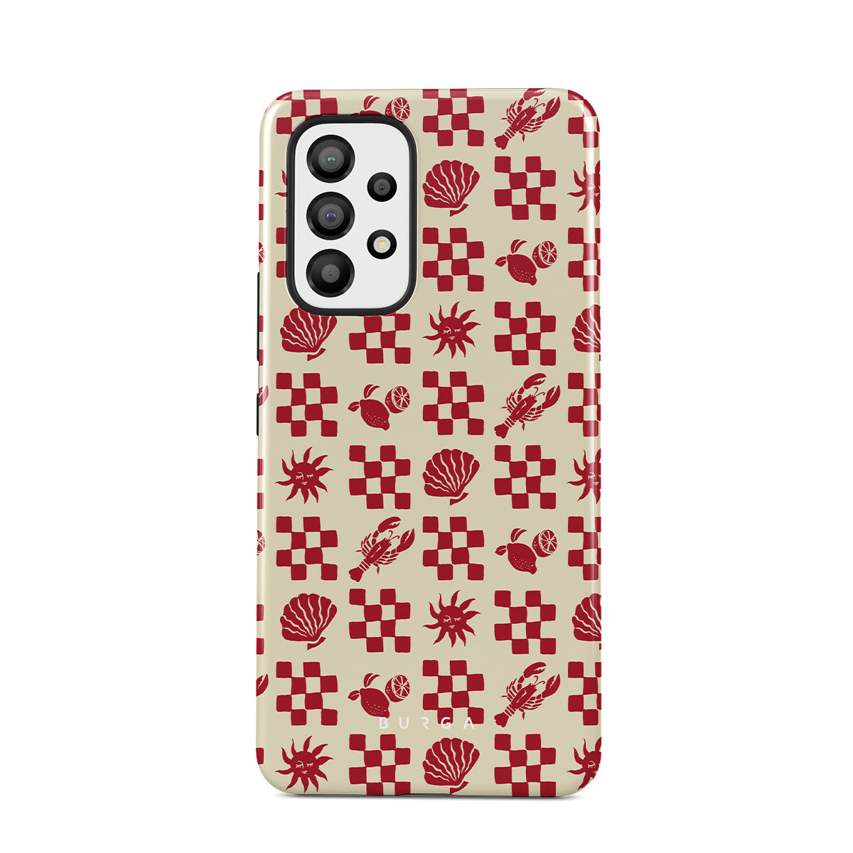 このデザインの特徴赤いチェック柄、貝殻、ロブスター、イタリアンモチーフが含まれています