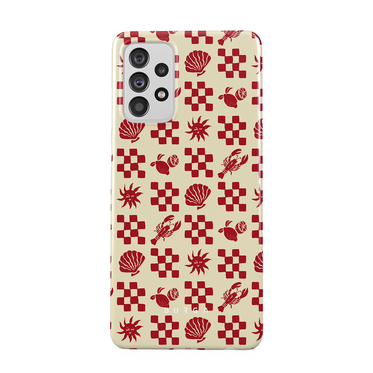 このデザインの特徴赤いチェック柄、貝殻、ロブスター、イタリアンモチーフが含まれています