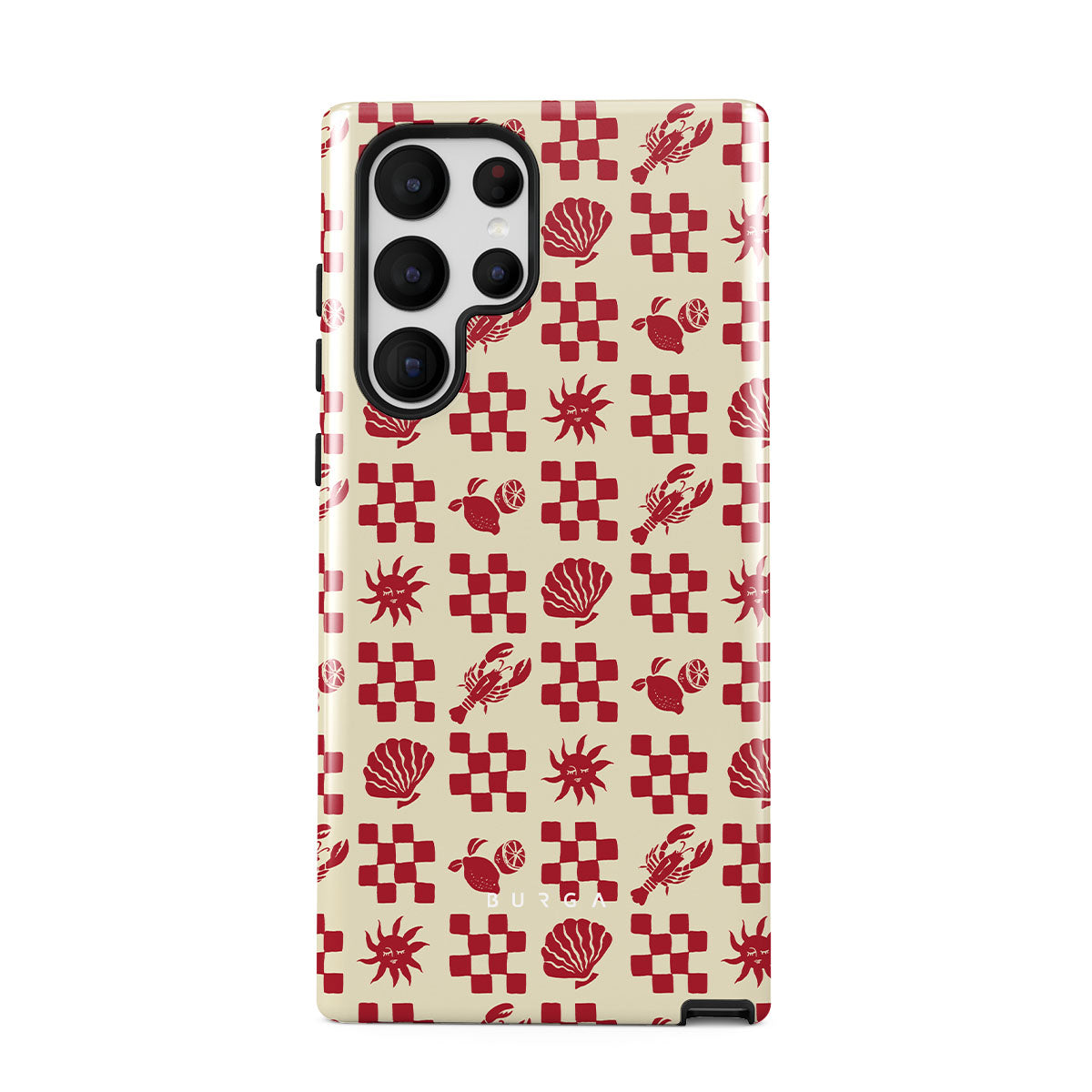 このデザインの特徴赤いチェック柄、貝殻、ロブスター、イタリアンモチーフが含まれています