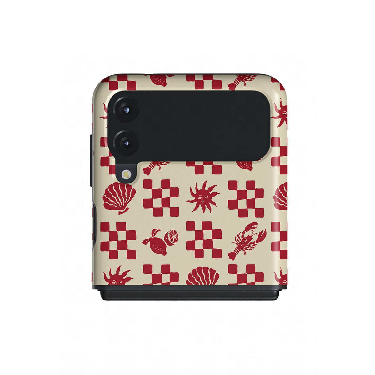 このデザインの特徴赤いチェック柄、貝殻、ロブスター、イタリアンモチーフが含まれています