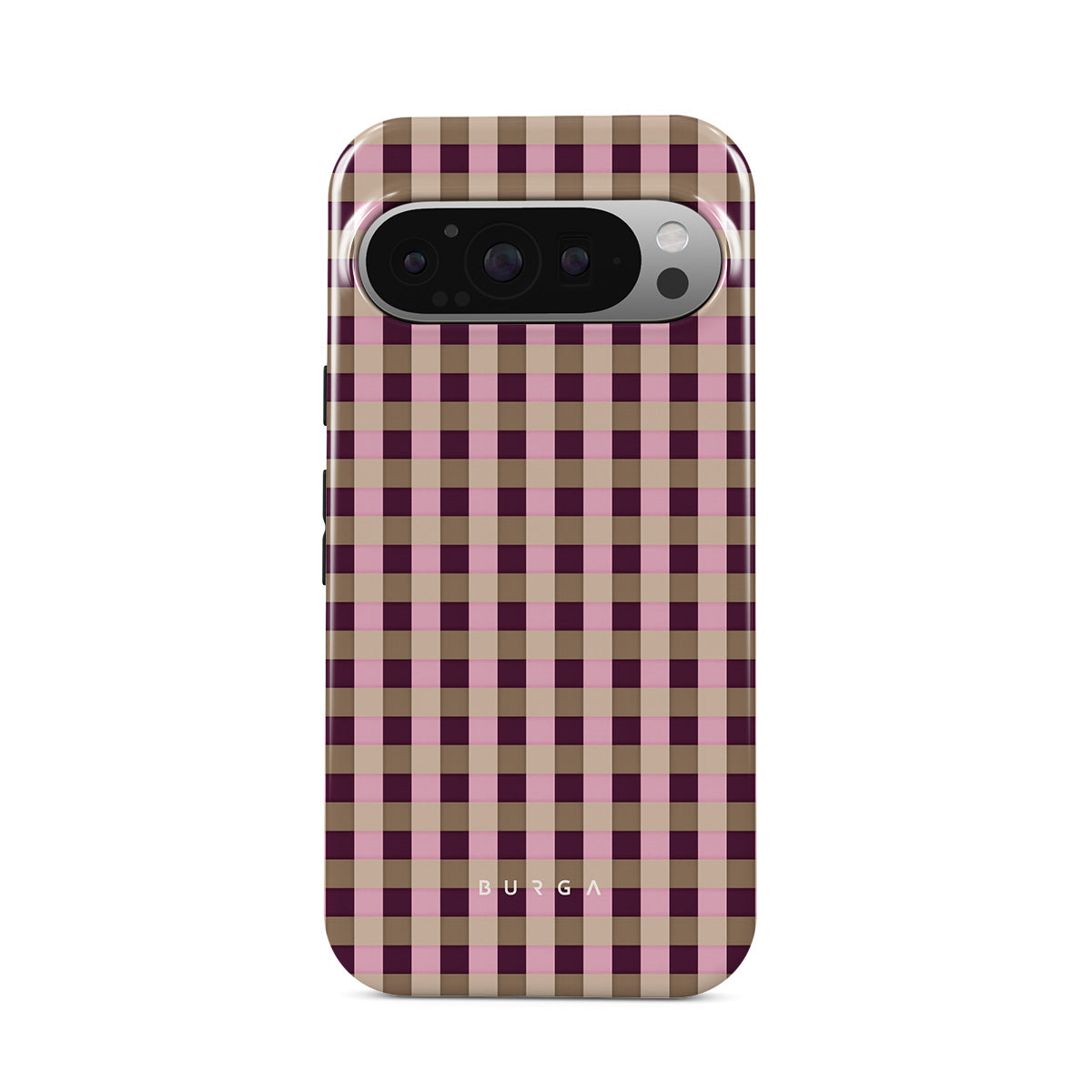 このデザインの特徴:ピンクとバーガンディのチェック柄で、モダンなスタイルが特徴です。