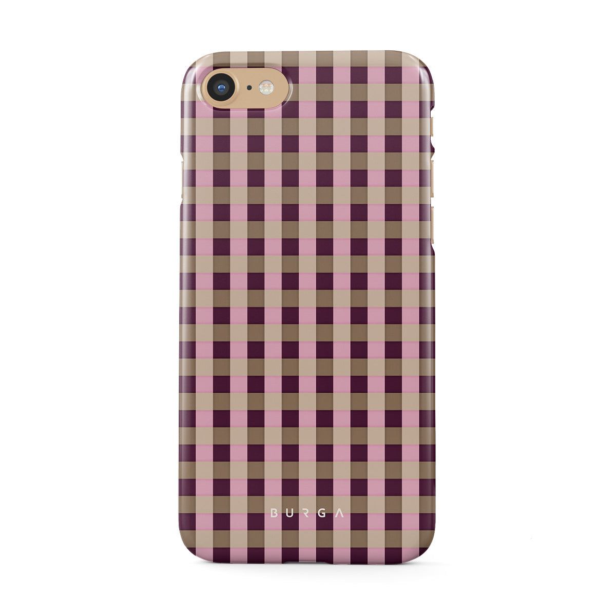 このデザインの特徴:ピンクとバーガンディのチェック柄で、モダンなスタイルが特徴です。