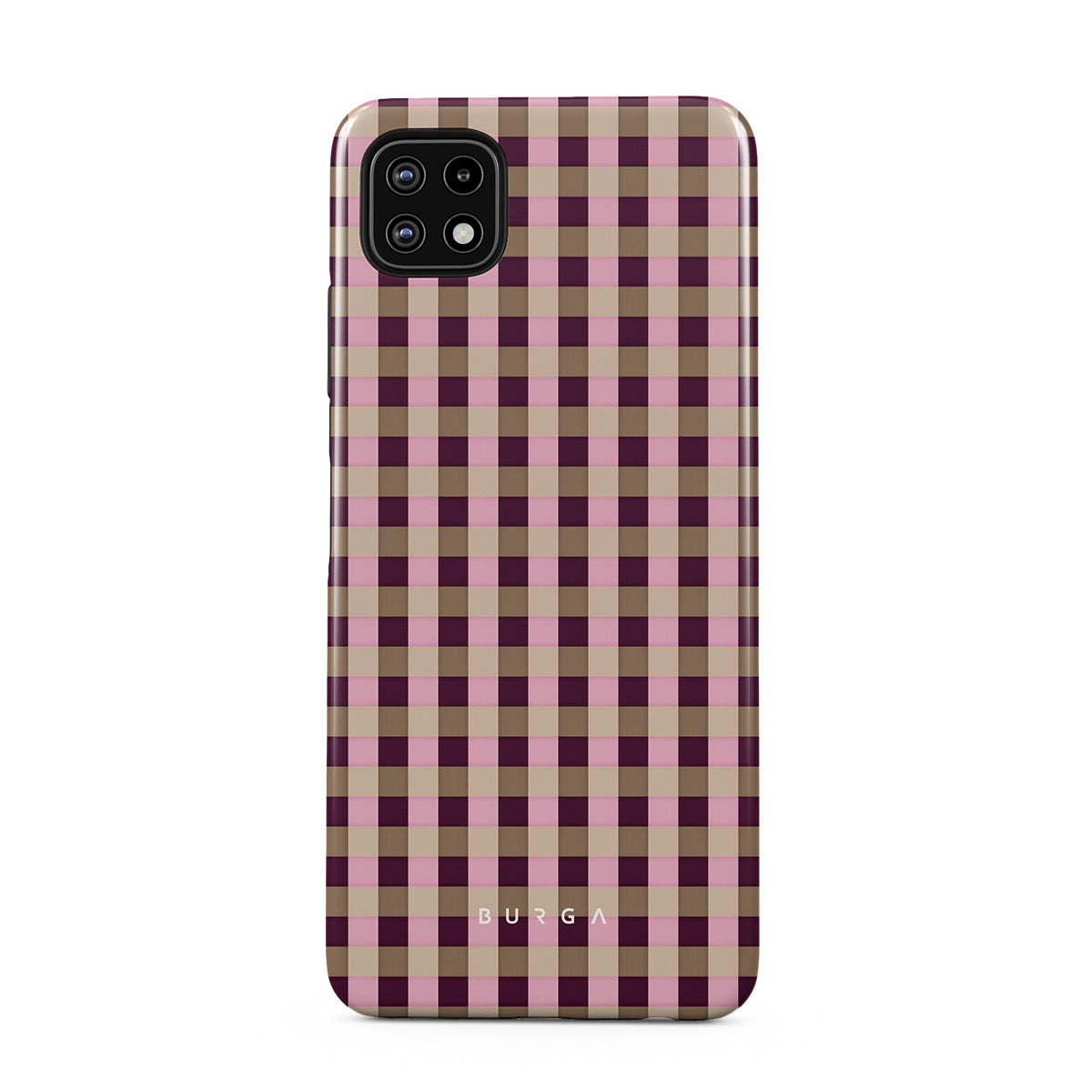 このデザインの特徴:ピンクとバーガンディのチェック柄で、モダンなスタイルが特徴です。
