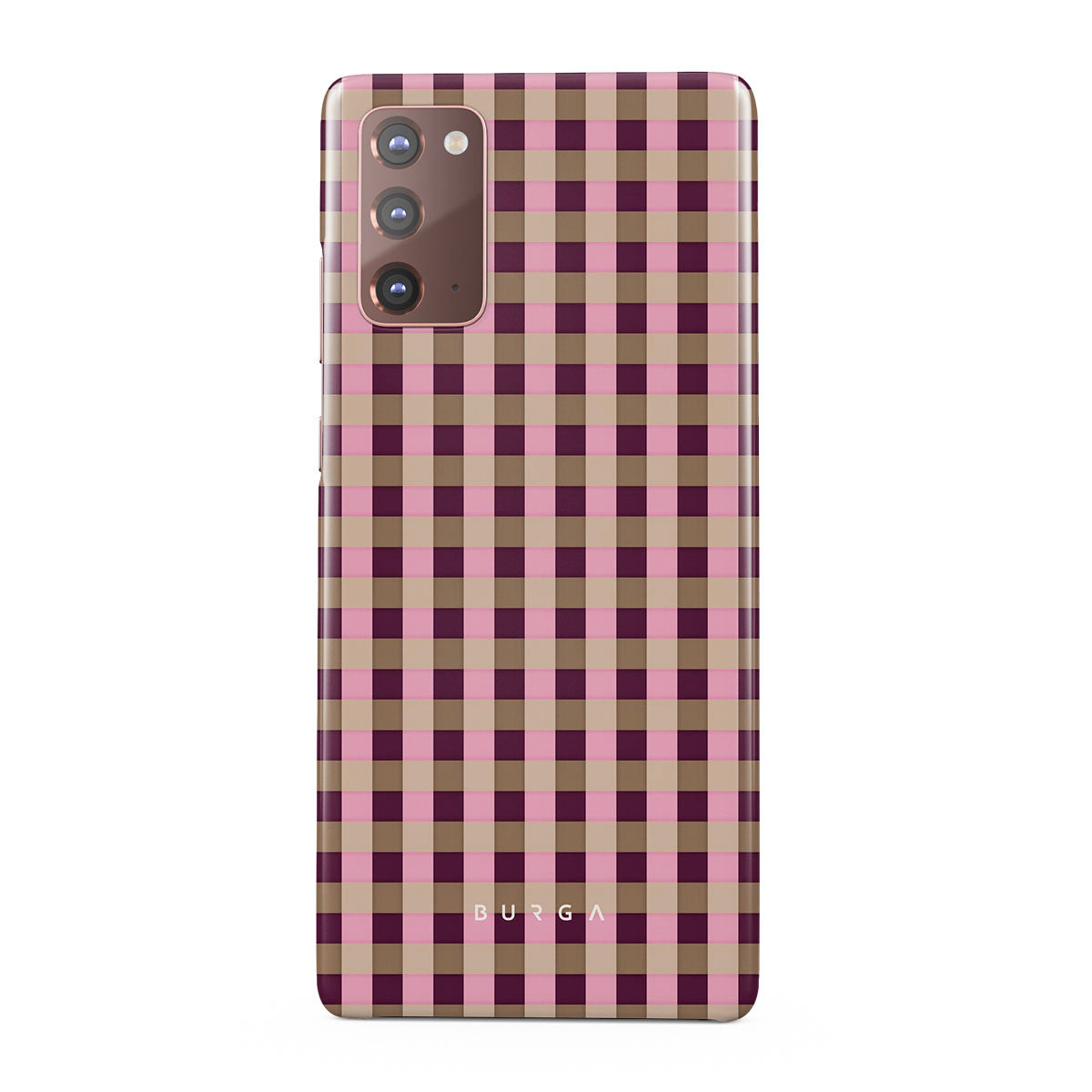 このデザインの特徴:ピンクとバーガンディのチェック柄で、モダンなスタイルが特徴です。