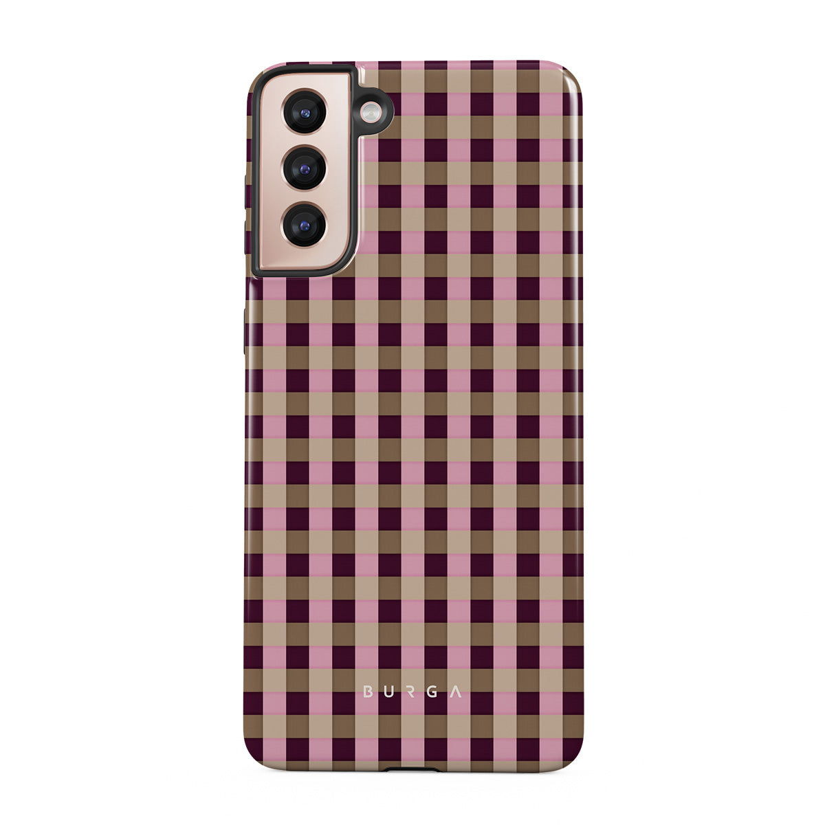 このデザインの特徴:ピンクとバーガンディのチェック柄で、モダンなスタイルが特徴です。
