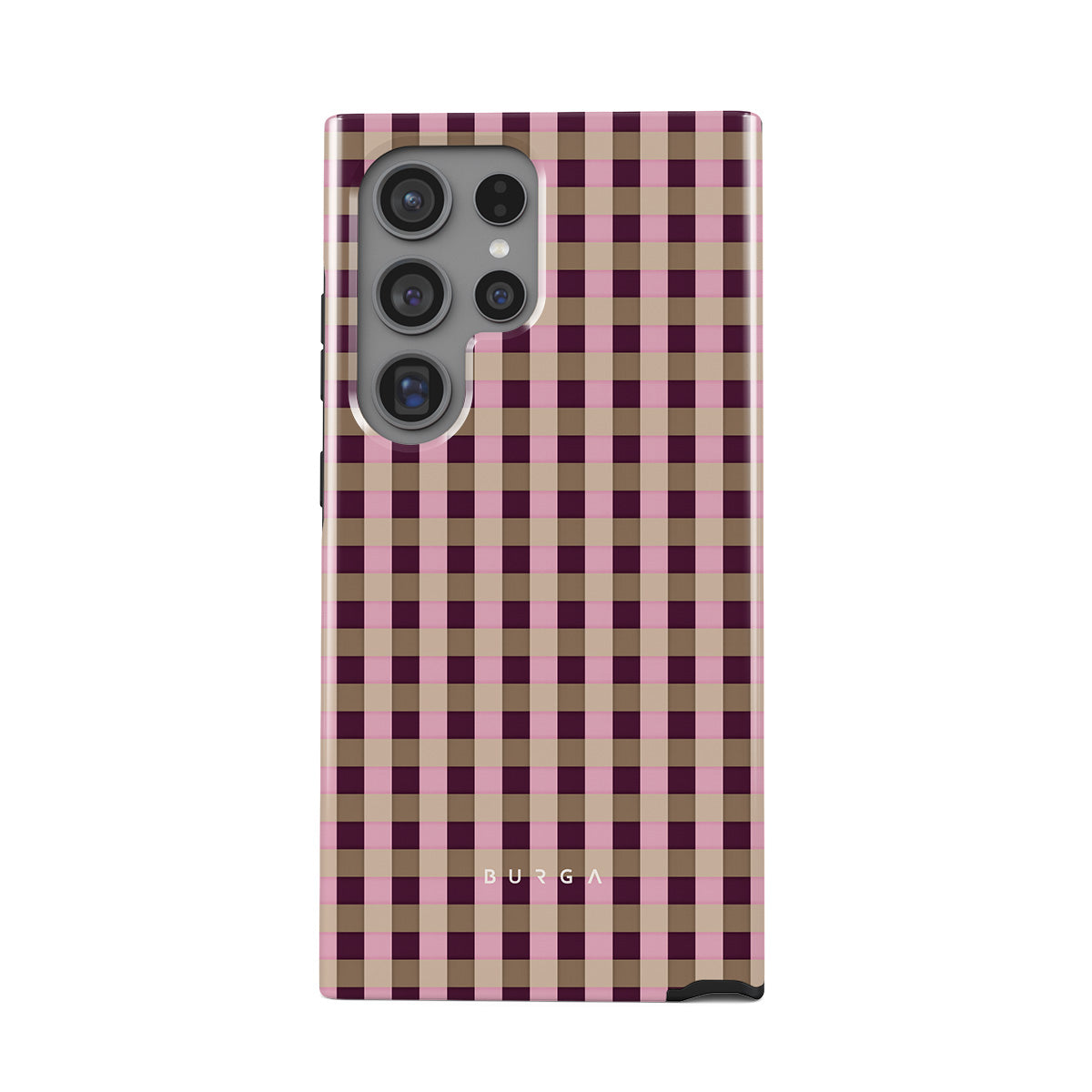 このデザインの特徴:ピンクとバーガンディのチェック柄で、モダンなスタイルが特徴です。