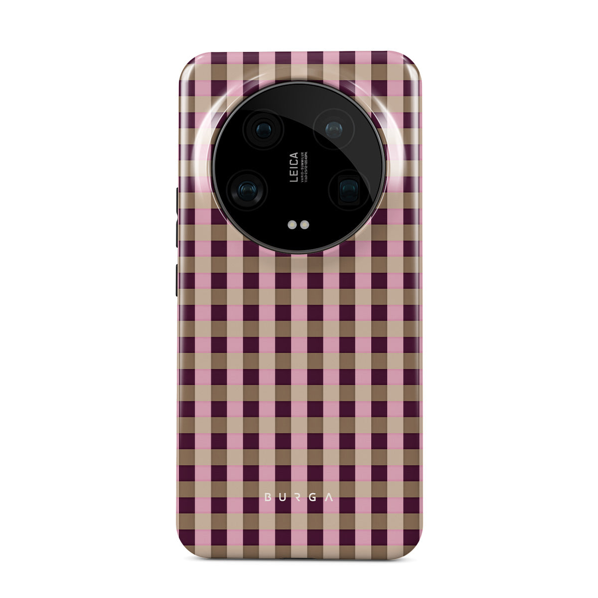 このデザインの特徴:ピンクとバーガンディのチェック柄で、モダンなスタイルが特徴です。