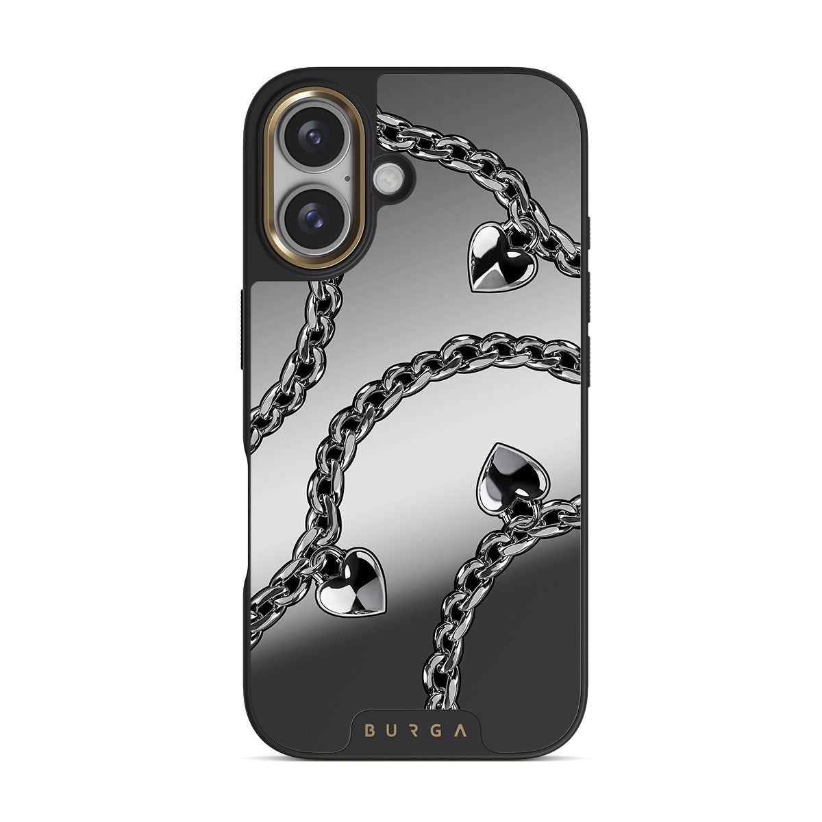 このデザインの特徴チェーン、ハート、シルバー、メタリックなディテール、ミラーが含まれています