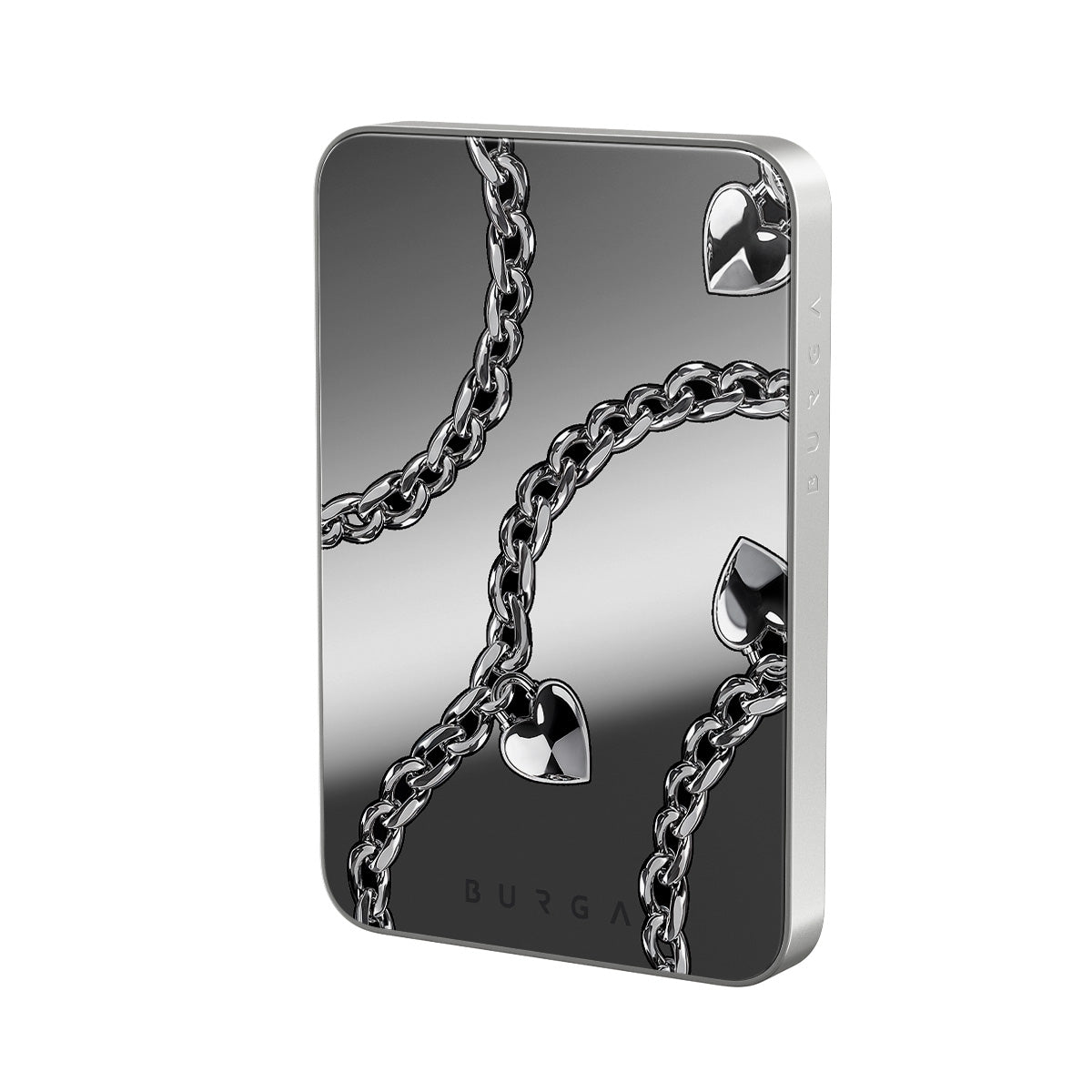 このデザインの特徴チェーン、ハート、シルバー、メタリックなディテール、ミラーが含まれています