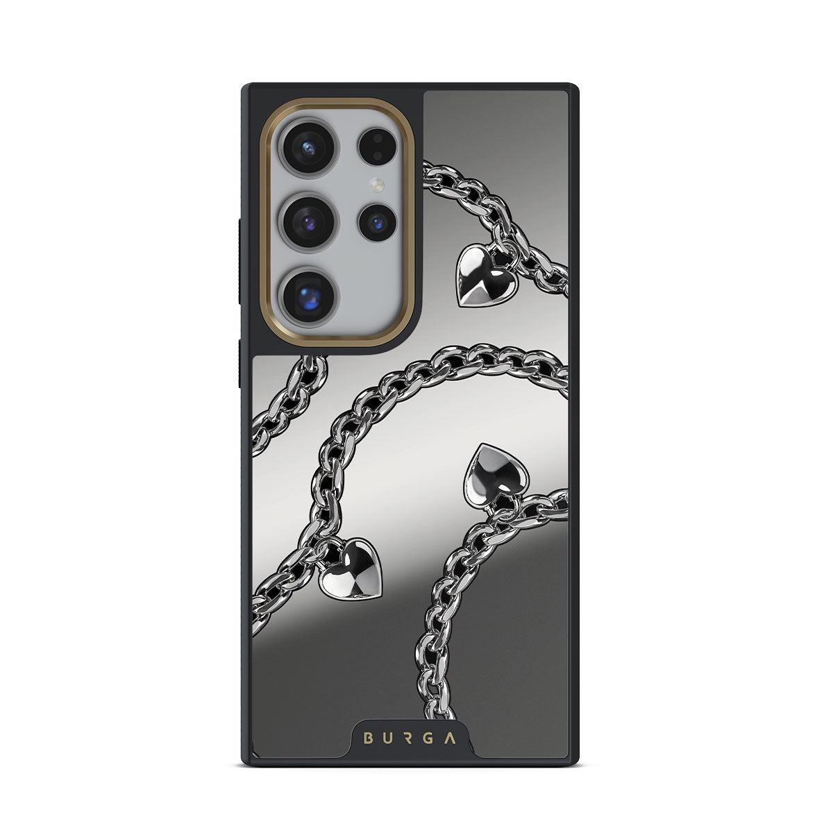このデザインの特徴チェーン、ハート、シルバー、メタリックなディテール、ミラーが含まれています