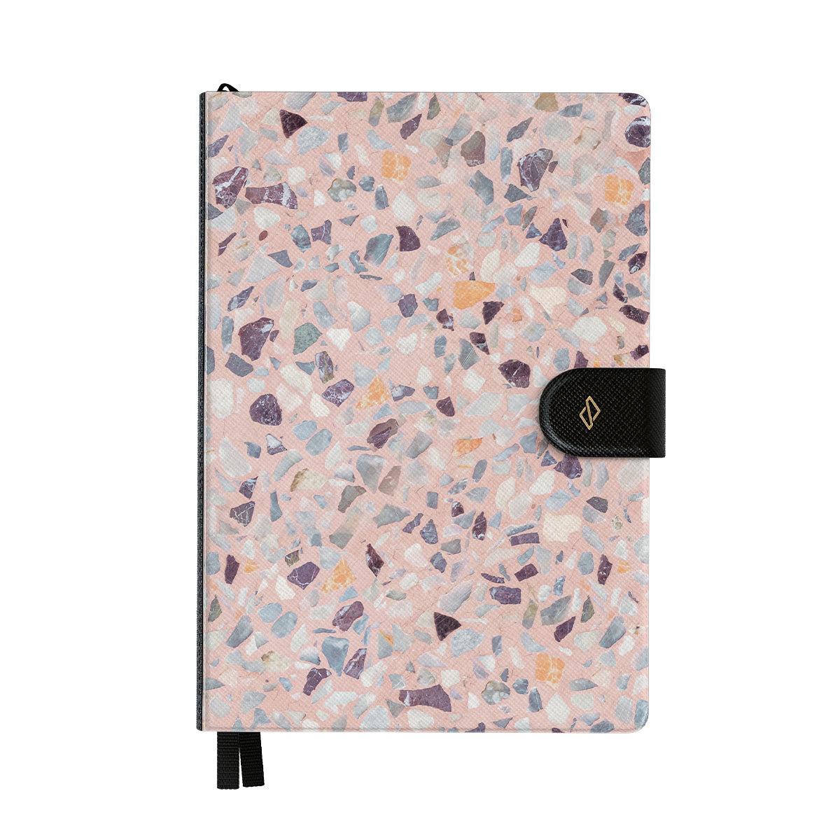 日付が書かれていないミニマリストなデザインで、手帳・スケジュール帳・ダイアリーとして使えます。表紙のハードカバーには、心地よい手触りのヴィーガンサフィアーノレザーを使用。スリムな磁気べえると付きの頑丈な手帳で、コーヒーをこぼしたり、うっかり手帳を落としたりしても安心です。
