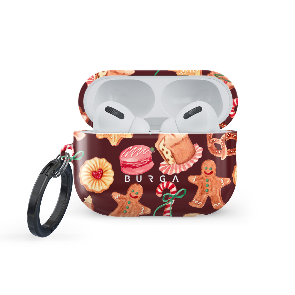 このデザインの特徴:クリスマスクッキー、ジンジャーブレッドマン、キャンディケイン、ペパーミントキャンディー、フェスティブなスイーツ、バーガンディーレッドの背景