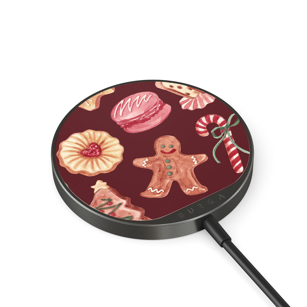 このデザインの特徴:クリスマスクッキー、ジンジャーブレッドマン、キャンディケイン、ペパーミントキャンディー、フェスティブなスイーツ、バーガンディーレッドの背景