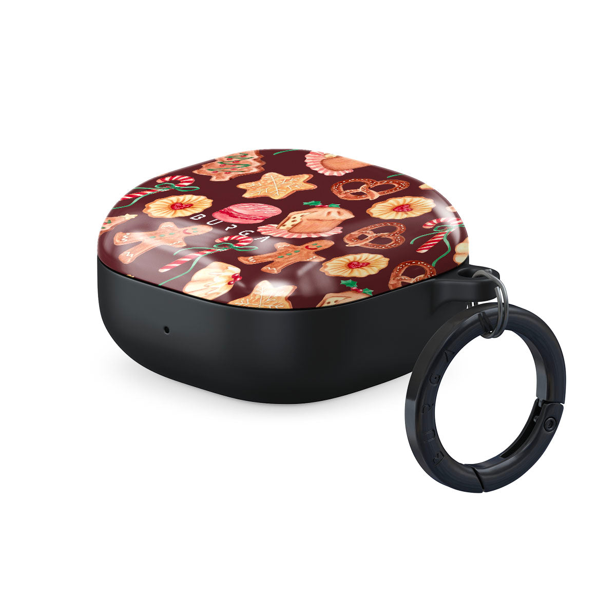 このデザインの特徴:クリスマスクッキー、ジンジャーブレッドマン、キャンディケイン、ペパーミントキャンディー、フェスティブなスイーツ、バーガンディーレッドの背景