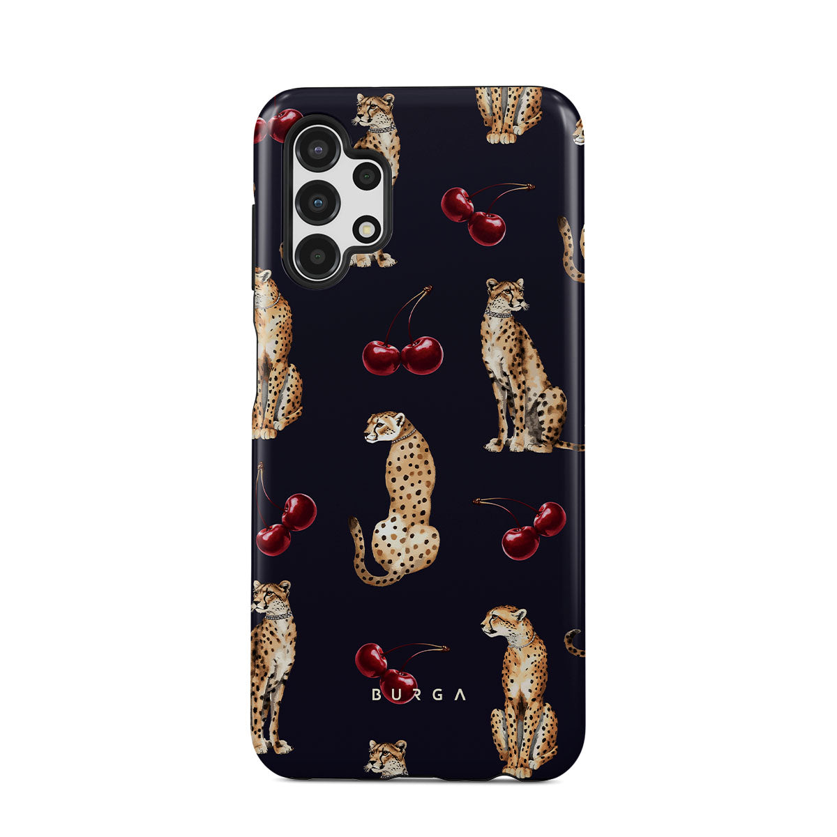 このデザインの特徴:チーターパターン、チーター、チェリー