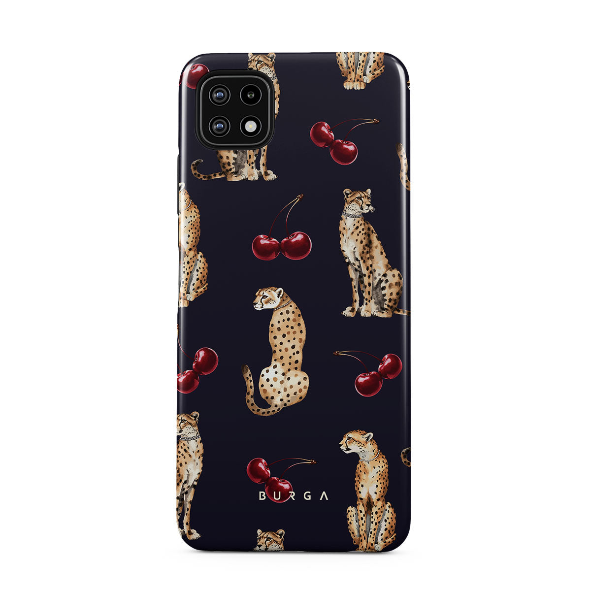 このデザインの特徴:チーターパターン、チーター、チェリー
