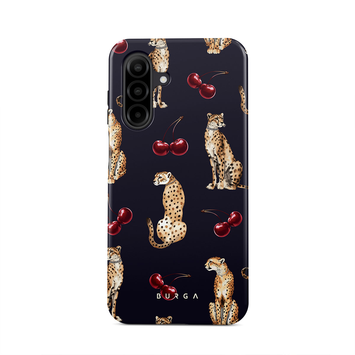このデザインの特徴:チーターパターン、チーター、チェリー