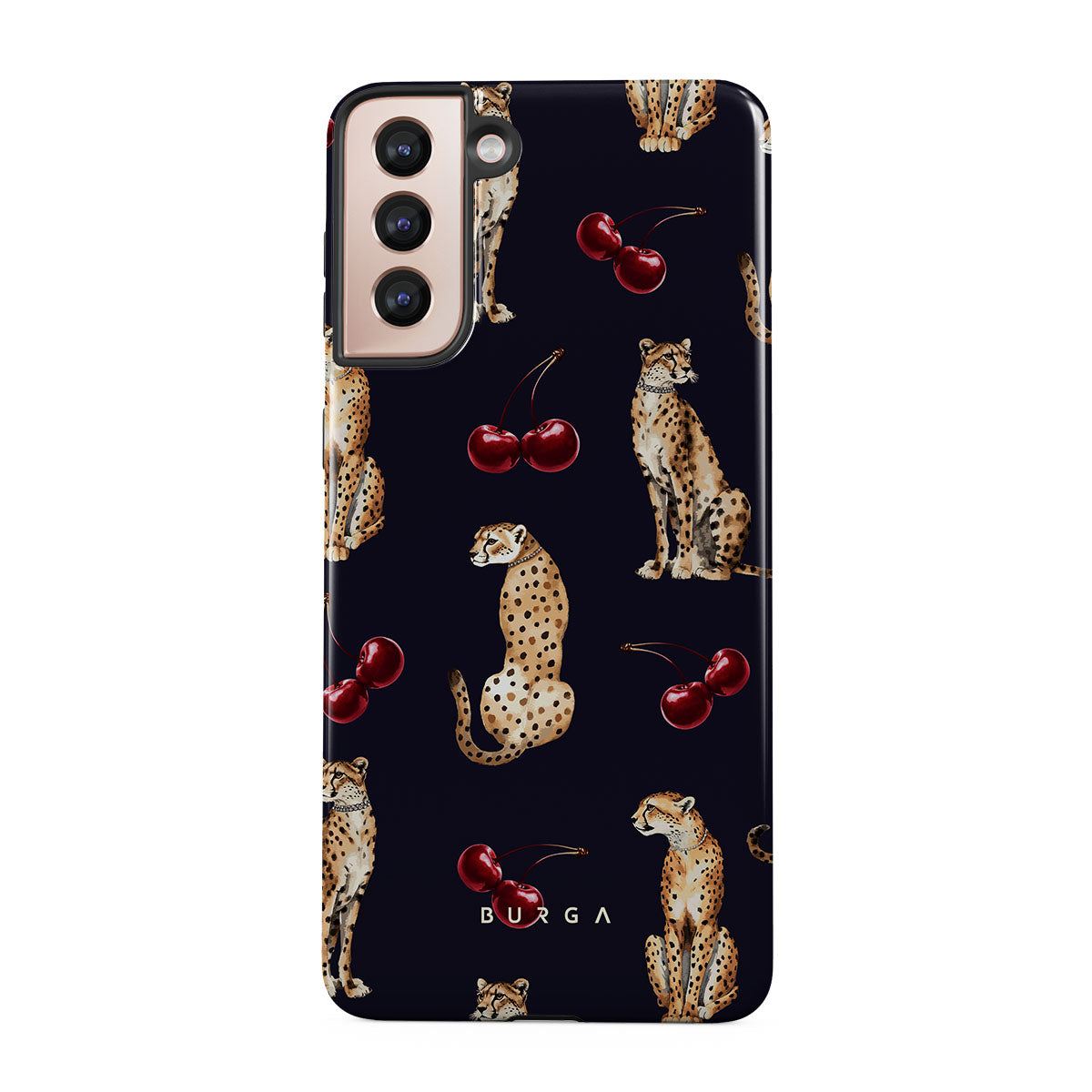 このデザインの特徴:チーターパターン、チーター、チェリー