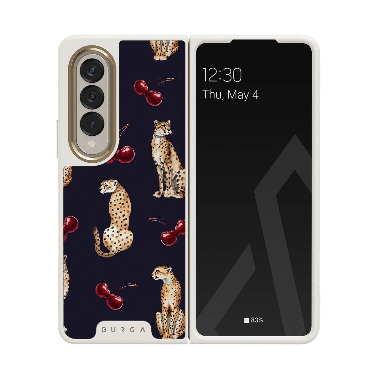 このデザインの特徴:チーターパターン、チーター、チェリー