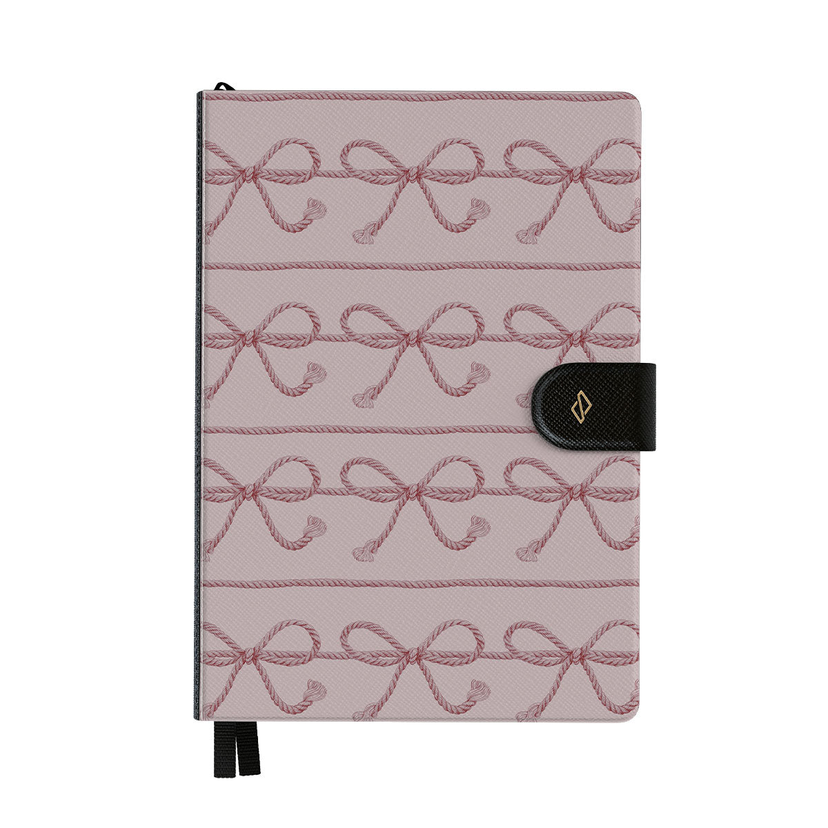 このデザインの特徴:ピンクのちょう結び、ピンクの背景、ロープ、遊び心あふれる柄