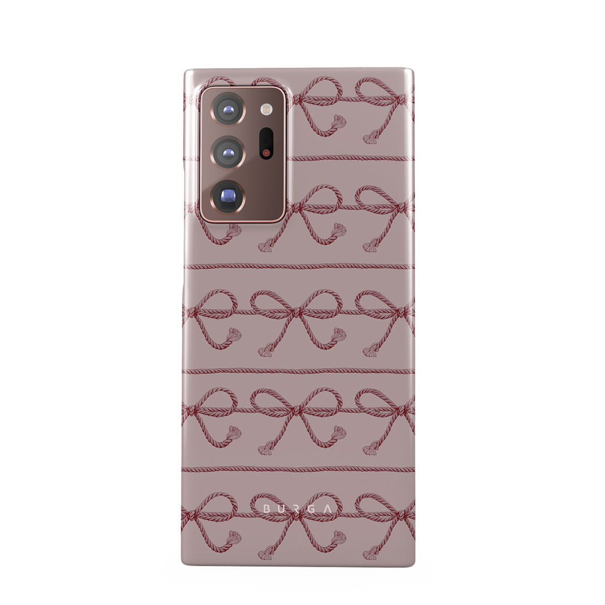 このデザインの特徴:ピンクのちょう結び、ピンクの背景、ロープ、遊び心あふれる柄
