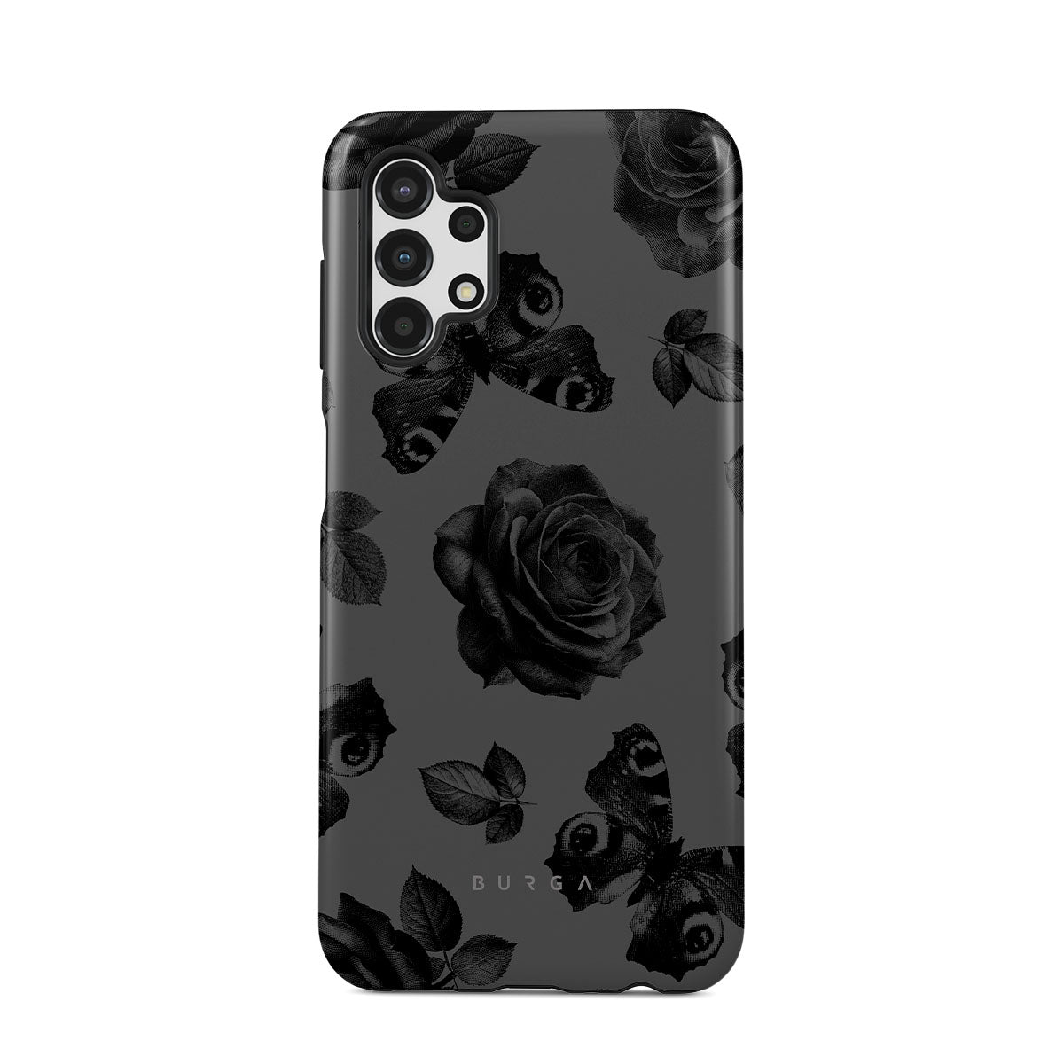 このデザインの特徴:黒いバラ、ゴシック調の花柄、落ち着いた色合い。