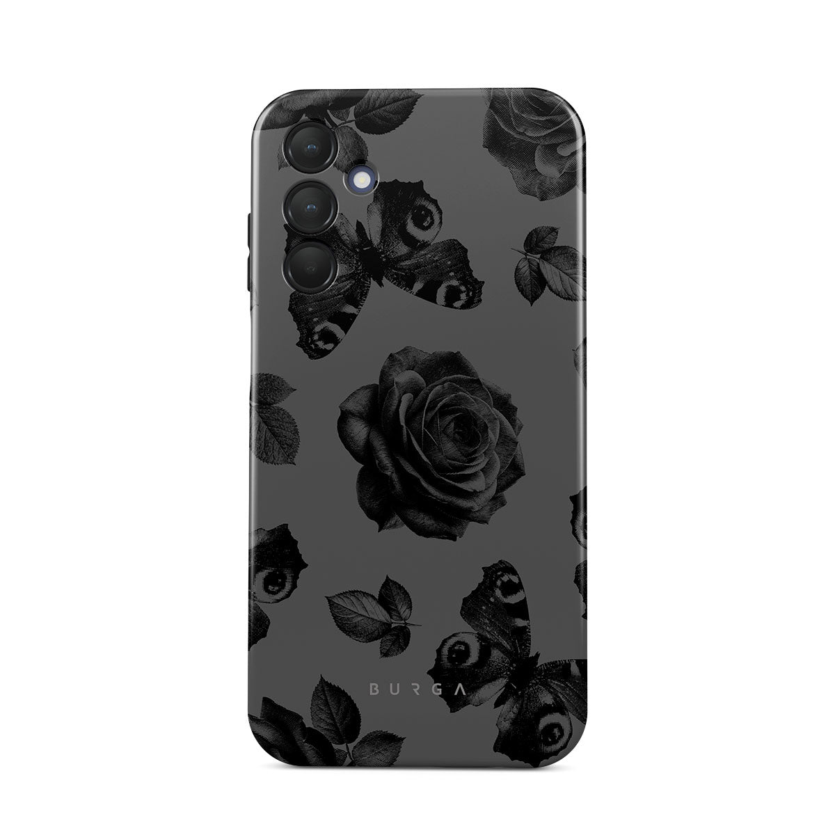 このデザインの特徴:黒いバラ、ゴシック調の花柄、落ち着いた色合い。