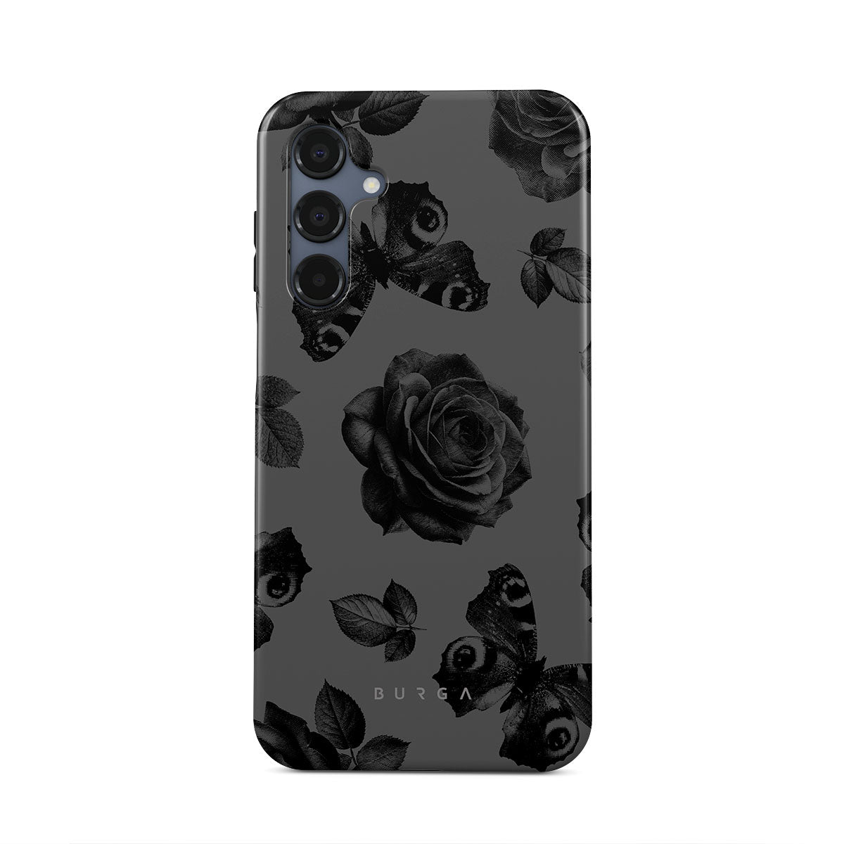 このデザインの特徴:黒いバラ、ゴシック調の花柄、落ち着いた色合い。